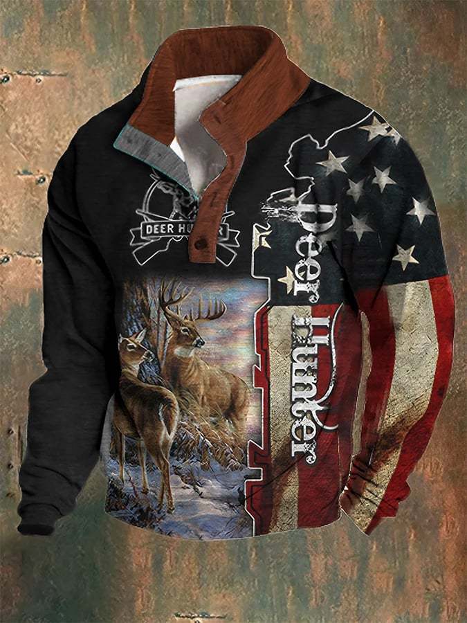 Men's Western Deer Hunting Print Stand Collar Button-Down Sweatshirt in Plush Fabric
