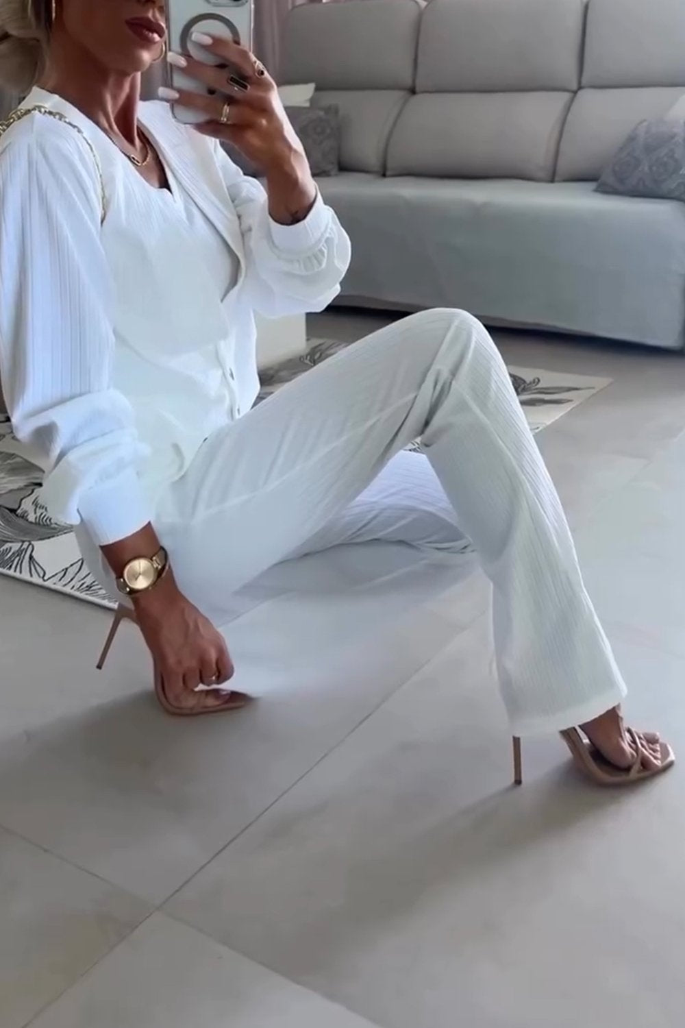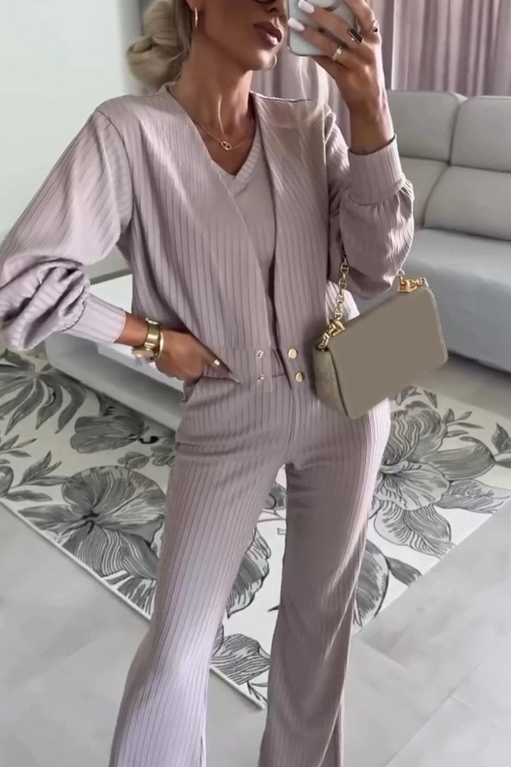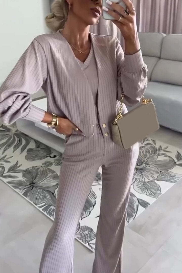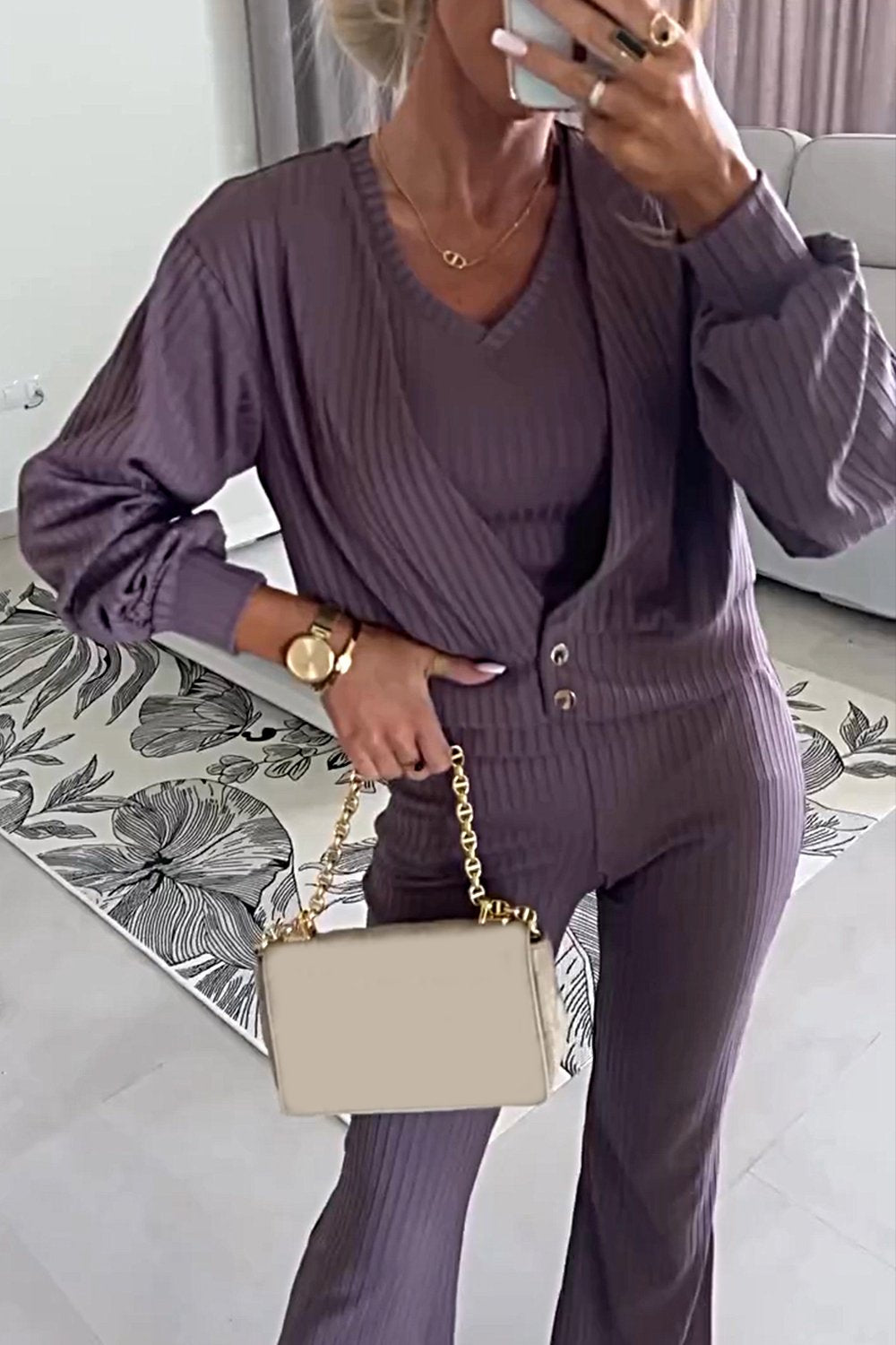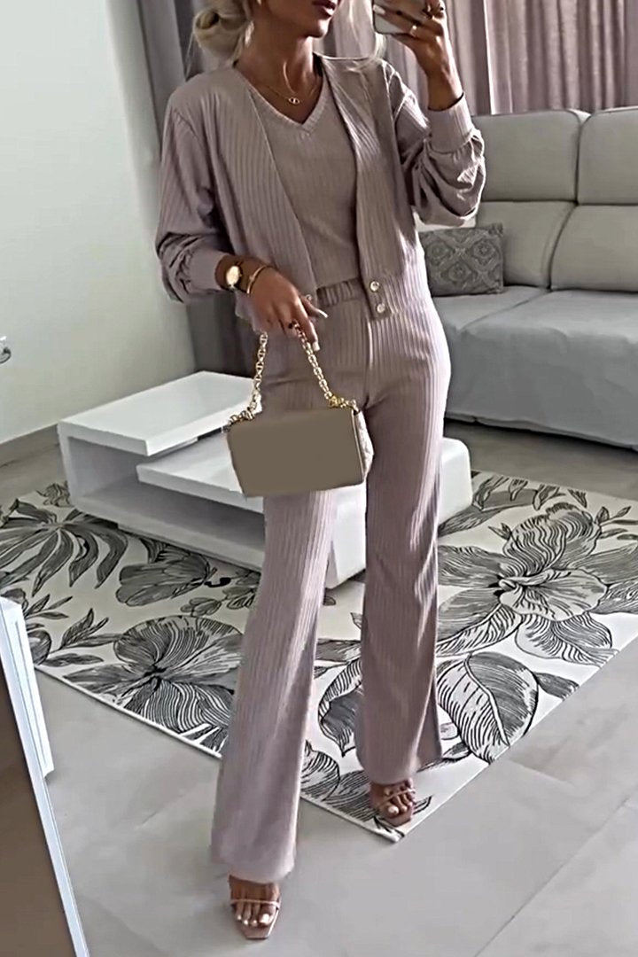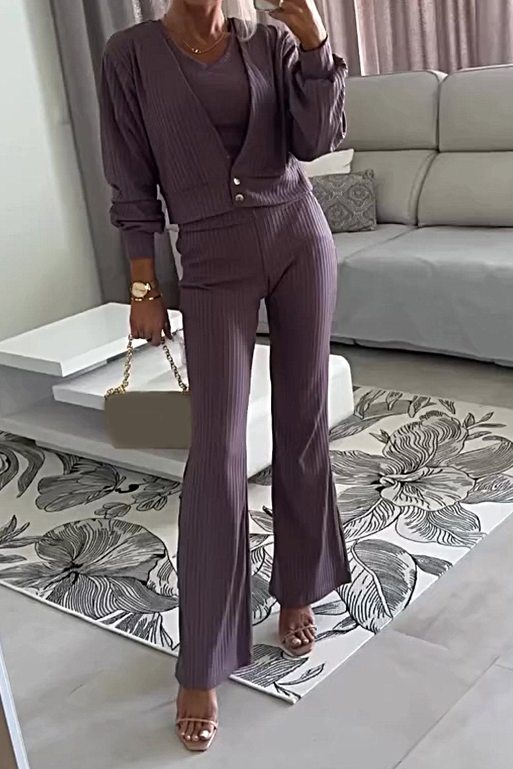 Women's Solid Color Cardigan Top Vest & Slightly Flared Pants Three-piece Set